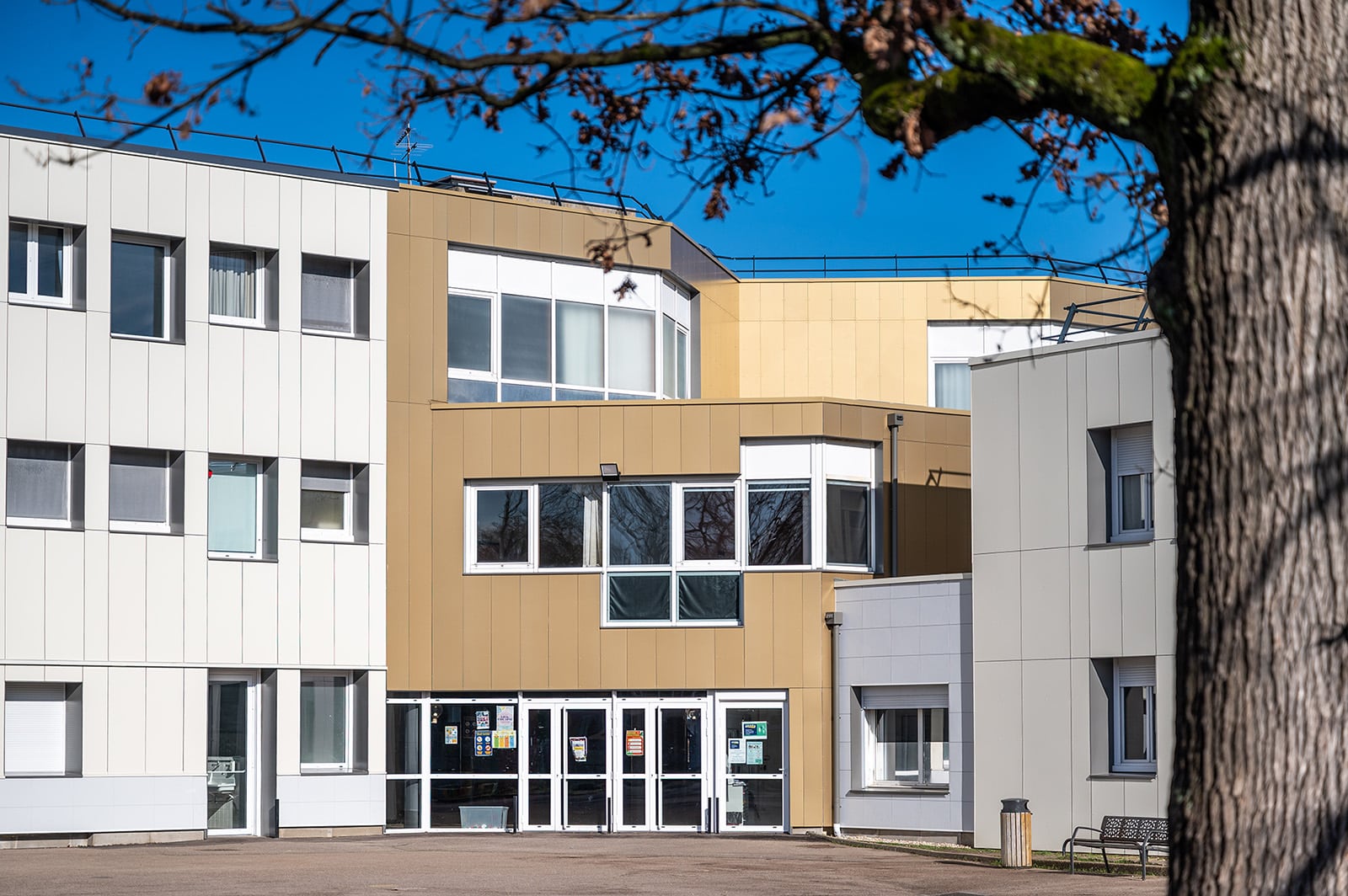 L’entrée principale, rendue lisible et valorisée par une vêture métallique de teinte ‘champagne’ et des encadrements de menuiseries de teinte aluminium gris quartz, affirme une nouvelle identité institutionnelle, sobre et accueillante. Le projet rationalise les façades, modernise la salle polyvalente, et introduit des dispositifs techniques performants (VMC double flux, pompe à chaleur, LED, photovoltaïque).